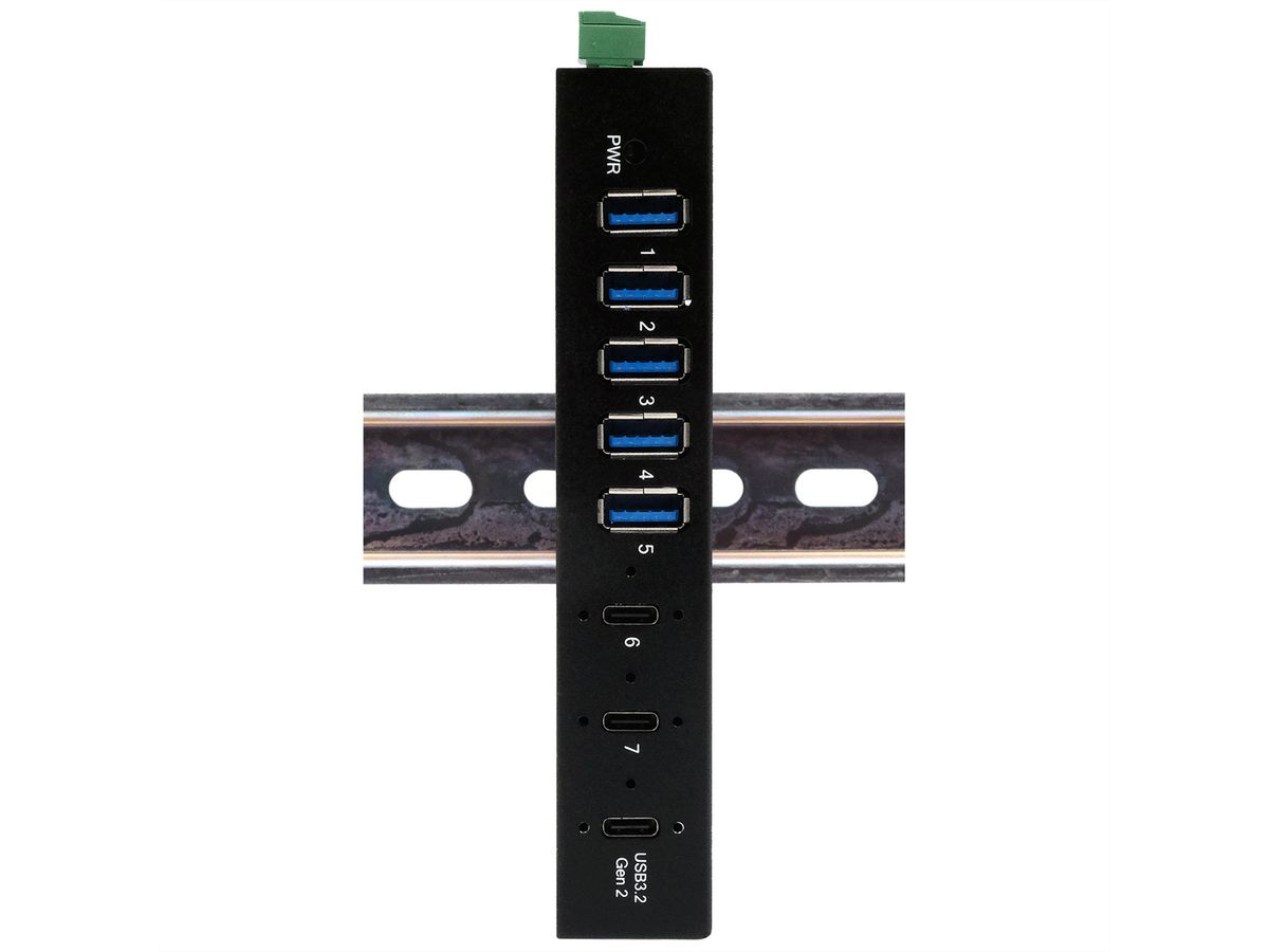 Der robuste und industrietaugliche EX-12297HMS ist ein USB 3.2 Gen 2x1 Metall-Hub für bis zu sieben Endgeräte, der an der Wand oder auf einer Hutschiene montiert werden kann.