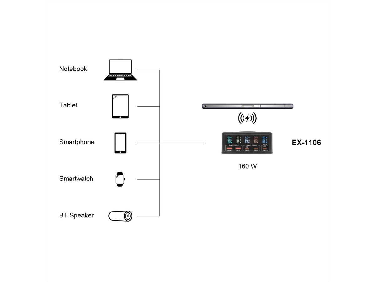 Die EX-1106 ist eine Multiport-Ladestation mit integriertem Wireless Charger und einer Gesamtleistung von 160 W. Sie verfügt über drei USB-C Power Delivery (PD) Ports mit einer Leistung von jeweils max. 65 W zum Laden von Notebooks/MacBooks und zwei Schnellladeanschlüsse für Quick Charge 3.0-kompatible Geräte.