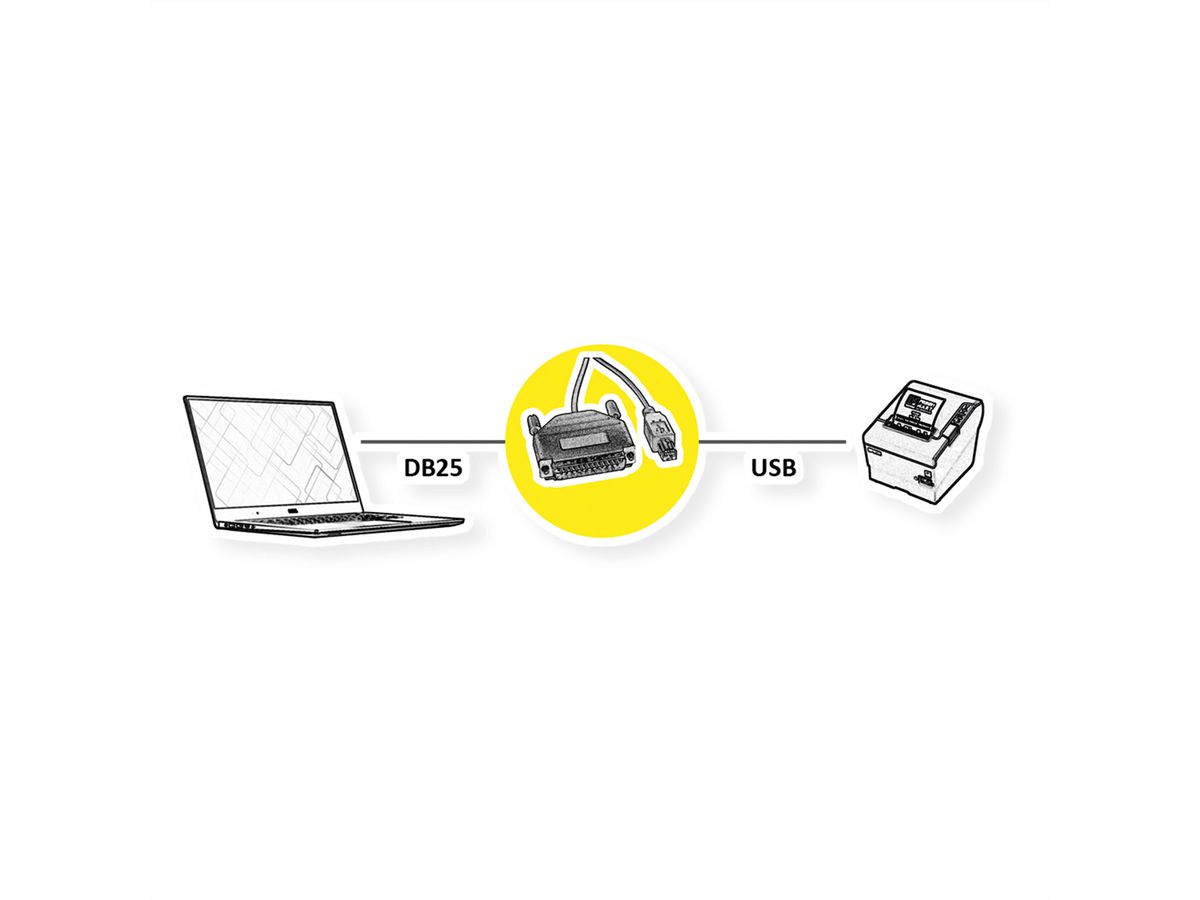 - Anschluss am PC: SUB-D25 Buchse; Anschluss am Drucker: USB Typ B Buchse