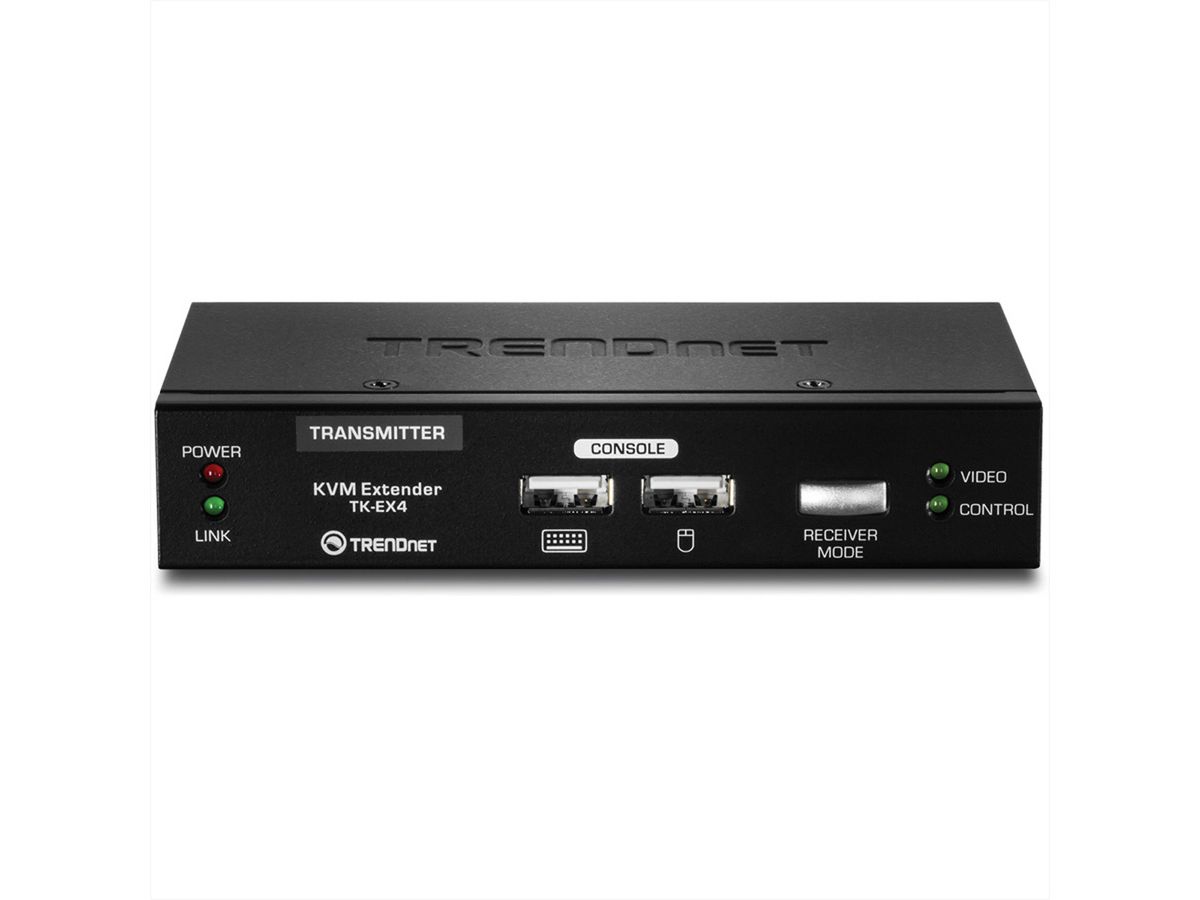 TRENDnet’s KVM Extendersatz vom, Modell TK-EX4, erweitert Tastatur-, Video- und Mauskontrollen auf Entfernungen von bis zu 100Metern (328 fuss). Es ist keine Softwareinstallation erforderlich—schließen Sie einfach den Sender und Empfänger an für volle KVMKontrolle.