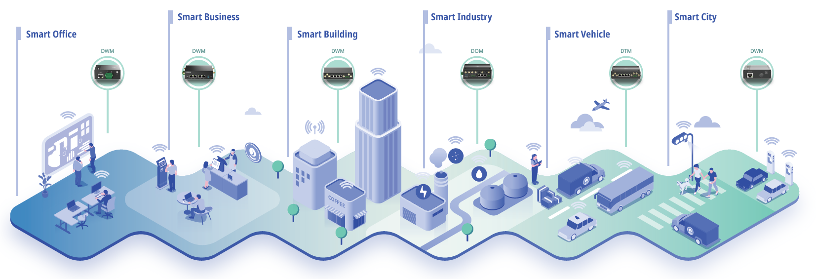 Die DWM-Serie bietet zuverlässige, sichere Verbindungen für intelligente Geschäftsanwendungen, die DOM-Serie stellt verschiedene Schnittstellen zur Integration von IoT-Geräten in intelligente Industrieumgebungen bereit, und die DTM-Serie bietet Echtzeit-Standortverfolgung sowie EN 50155-Zertifizierung für den Einbau in intelligente Fahrzeuganwendungen.